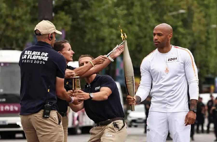 7月14日,在法国巴黎香榭丽舍大街,第一棒火炬手、法国国奥队主教练、法国前足球运动员亨利(右一)参加火炬传递。新华社记者高静摄