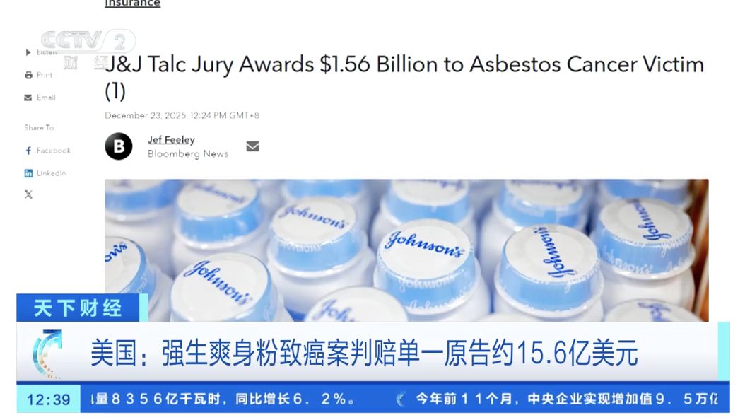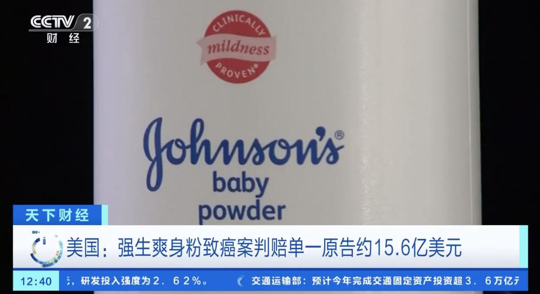 据央视财经报道,当地时间22日,美国马里兰州一个陪审团裁定,美国强生公司需向因使用其婴儿爽身粉产品而罹患癌症的一名女子,支付约15.6亿美元(约合人民币110亿元)赔偿。